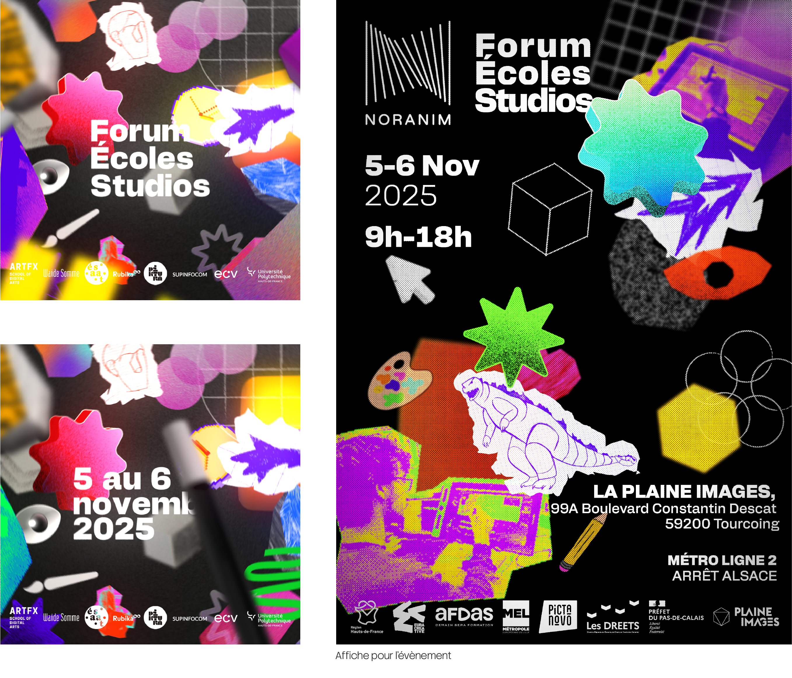 Le forum école studio est un lieu réunissant des artistes, créateur autour de l’animation. Dans un travail de groupe, nous sommes partis dans l’imagination d’un espace figée dans le temps, où tous les procédés, et style de l’animation française sont réunis au même endroit. En mélangeant illustration, photo, collage et 3D, on a recréé un foisonnement visuel à travers une esthétique maximaliste, colorée et dynamique.
